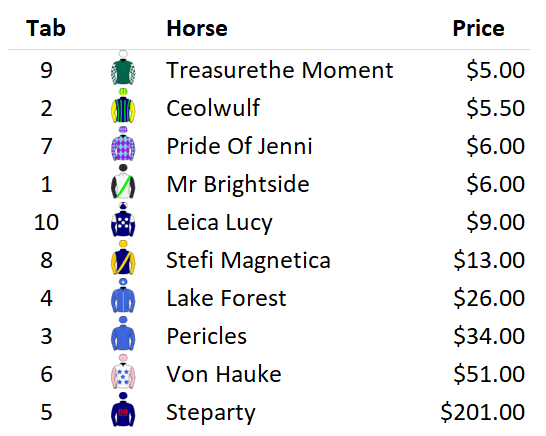 She’s short on ratings for now, coming off a 97.8 behind Pride Of Jenni last start when in an impossible spot, 13.8 lengths off the lead at the 600m mark. However, her closing splits over the final 800m hint at higher ratings in the locker. The forecast wet track is a positive, she shouldn’t be as far back this time, and if there’s to be a surprise in the race, she looks the one most capable of providing it.