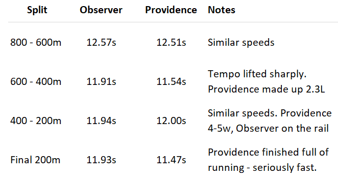 The tempo to the 800m was only moderate, with the middle splits particularly slow: 13.21s (1200–1000m) and 13.07s (1000–800m). From there, things got interesting. The table below compares how Observer and Providence closed off the race, with Observer’s final 200m adjusted two lengths faster than his recorded 12.26s to account for easing late.